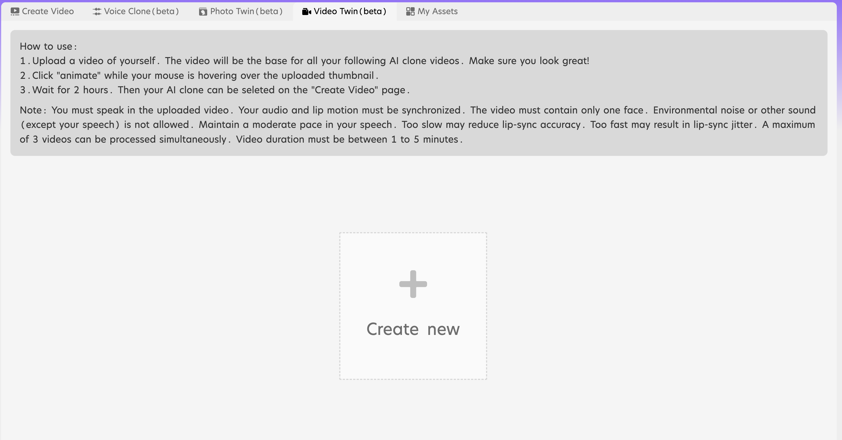 Wait for ~ 2 hours. Then go to create video tab. Refresh your browsers. You will see the thumbnail of your video clone.