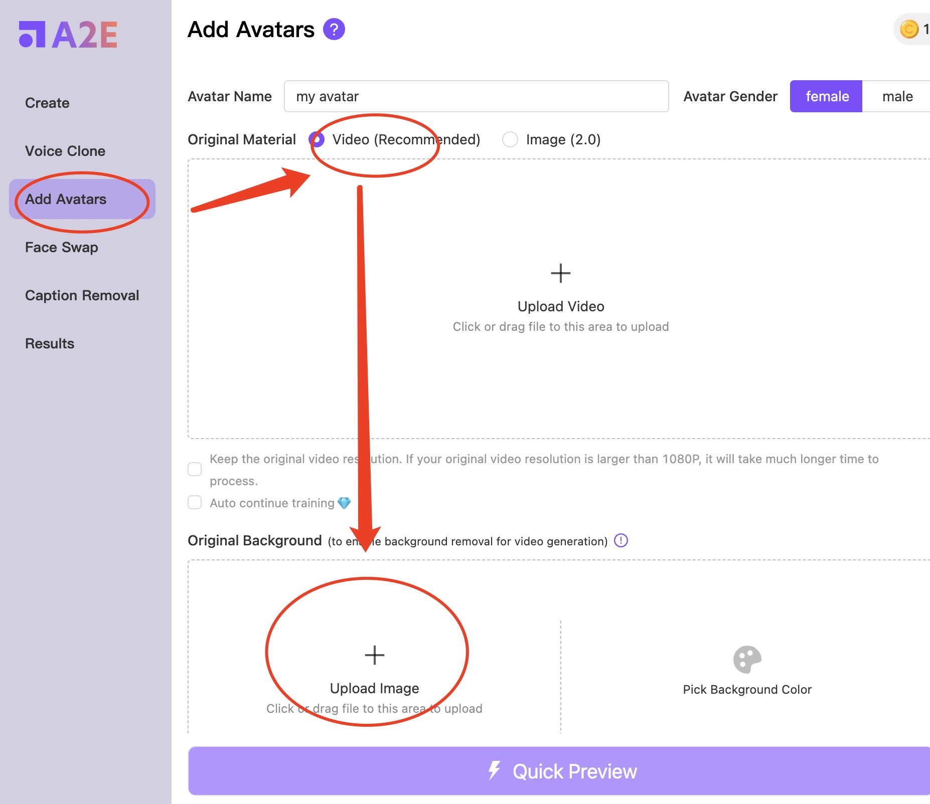 A2E allows you to create an avatar using either a short video clip (called base video) or an image. In this section, you will learn how to use an image of a real person to serve as the training data for generating your personalized AI avatar videos. In you choose this image mode, you will not be able to perform “continue training”. After you click “Quick Preview ⚡”, the training process usually finishes within 1 minute. This process costs 1 ????. You will not need to (cannot) perform “continue training” for image generated avatars afterwards.
